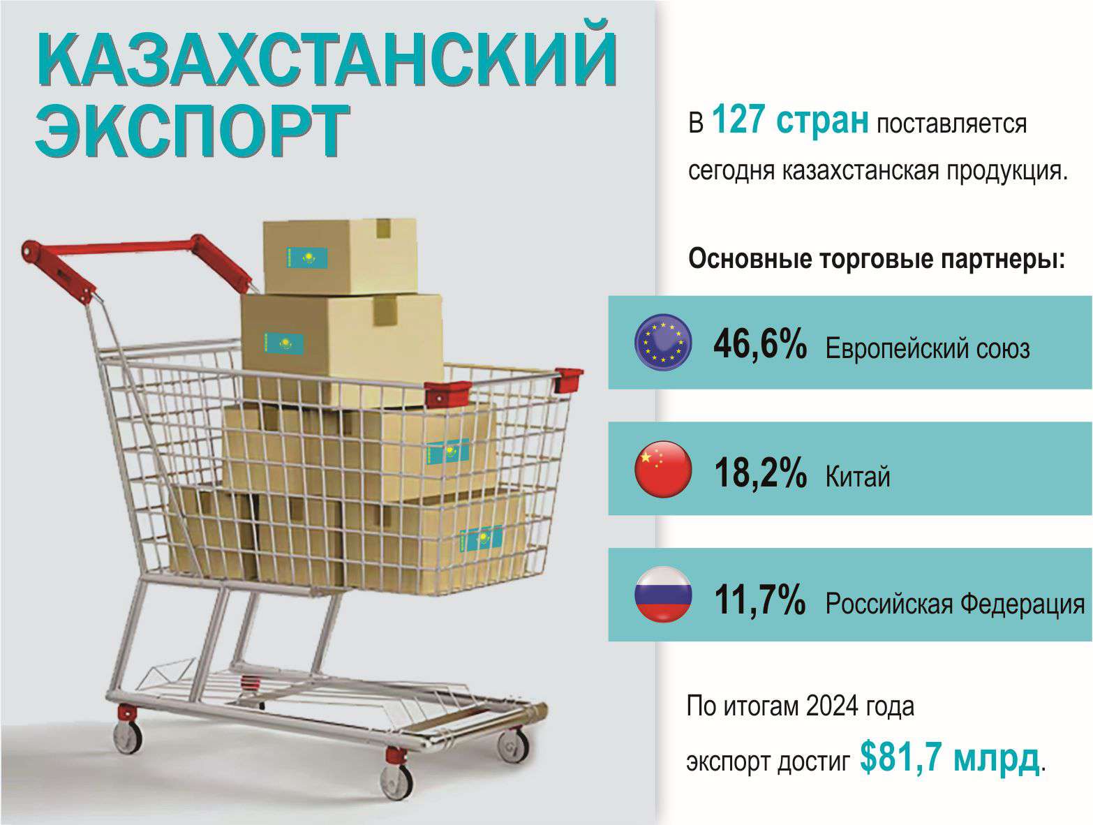 Қазіргі таңда қазақстандық өнімдер әлемнің 127 еліне жеткізіледі. Бұл еліміздің жаһандық сауда процестеріне жоғары деңгейде интеграцияланғанын көрсетеді.