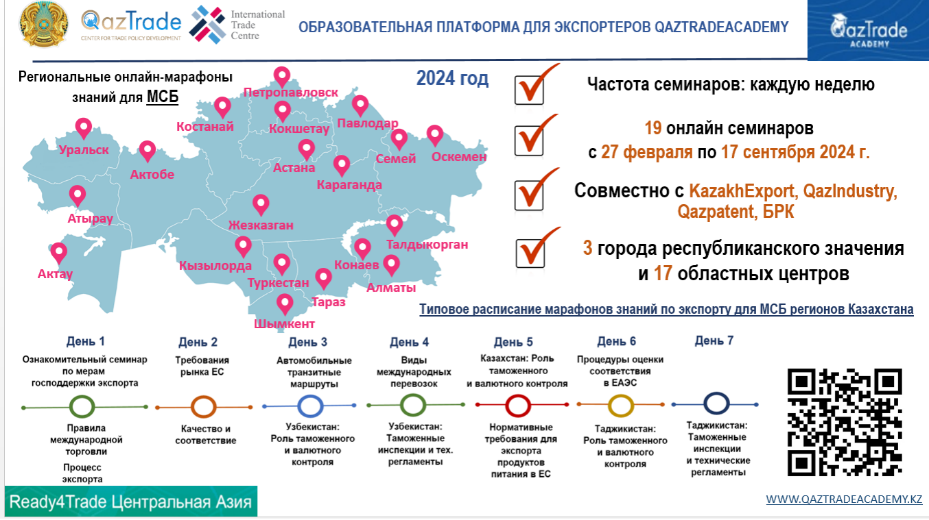 Всего до конца 2024 года будет проведено еще 10 семинаров и онлайн-марафонов по обучению экспортеров во всех регионах Казахстана, включая областные центры.
